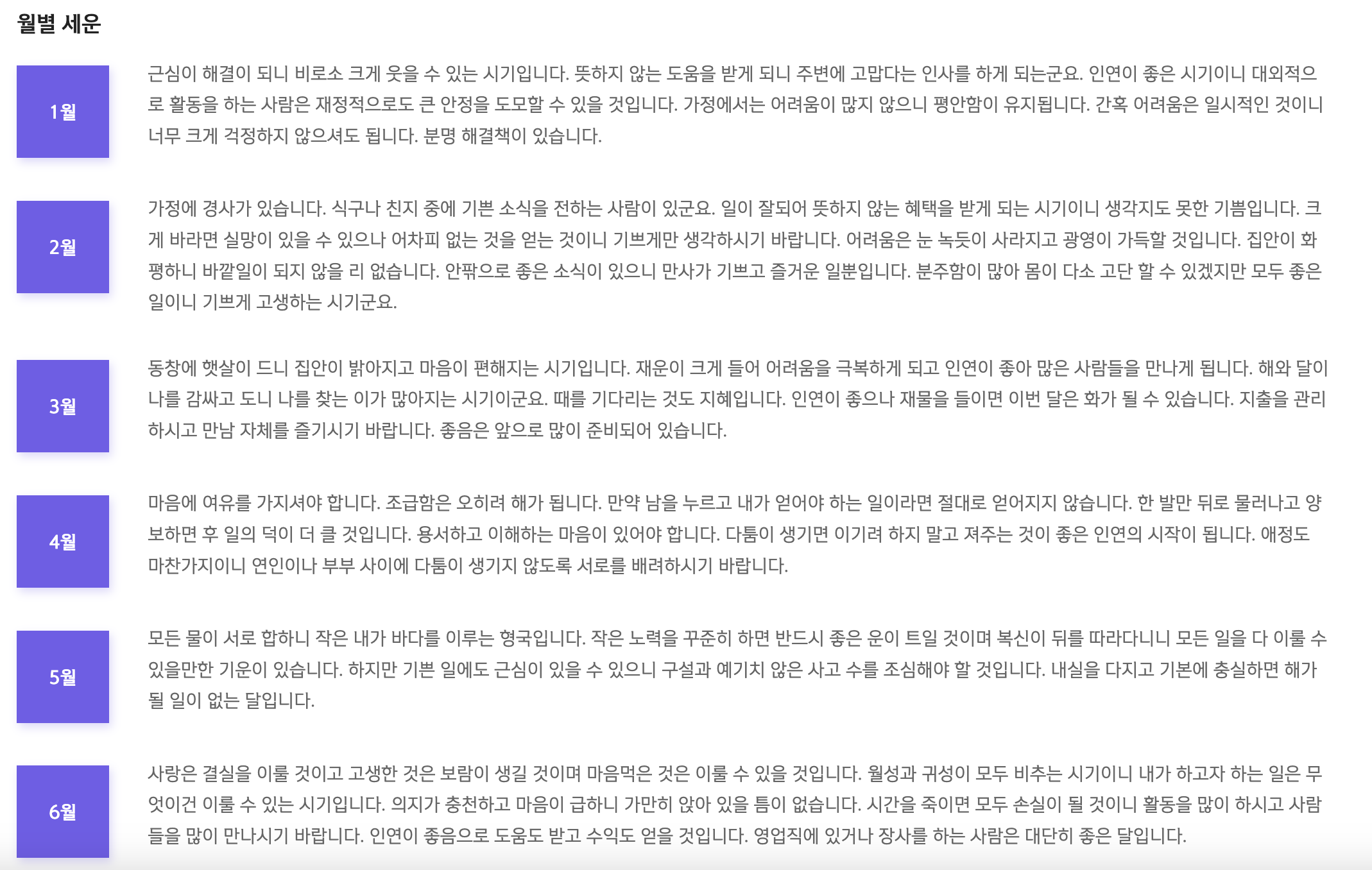 1-12월까지의 월별운세를 알려줍니다. 각각의 월별 팁들을 활용해야 한 달 한 달 잘 지내야겠어요.
